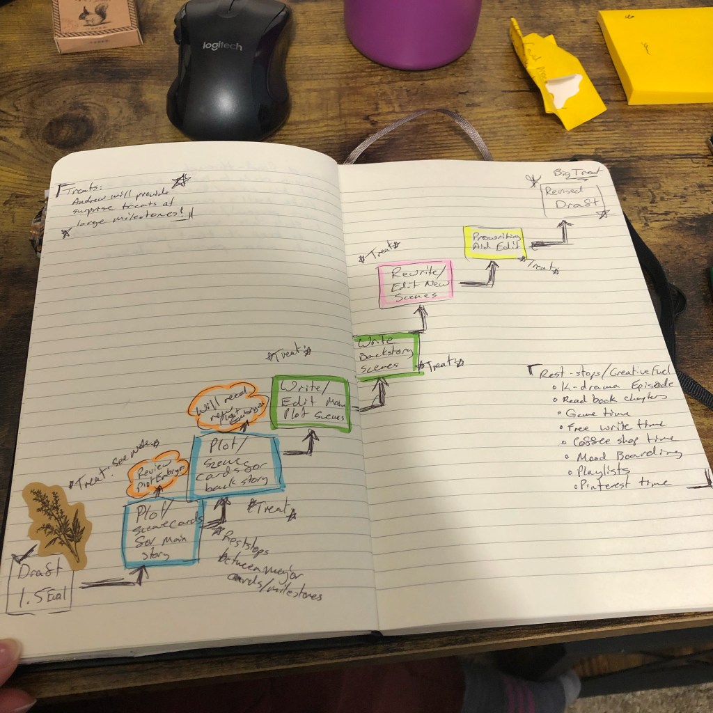 Before that I took the time to sketch out a “meaningful but manageable” steps map. This map, as I’ve shown in a previous blog post regarding another part of the process, highlights the steps needed to get to a specific point in the process of the project. Doesn’t matter what project you’re actively working on, whether creative or not, writing or not, it’s helpful to see the meaningful but manageable steps to get there. (Hint: start from where you want to go and work backwards to where you are currently.)