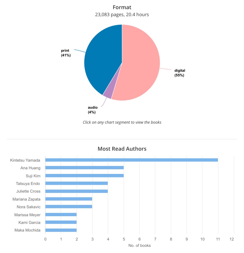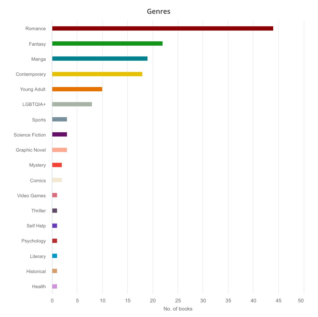 There was a manga spree at the beginning of the year, but then I decided around July to just let myself read whatever sounded good. I read a couple of very sweet romcoms and then that snowballed into devouring 44 romance novels. These were not short, fluffy books a lot of the time, but massive 500+ page tomes.