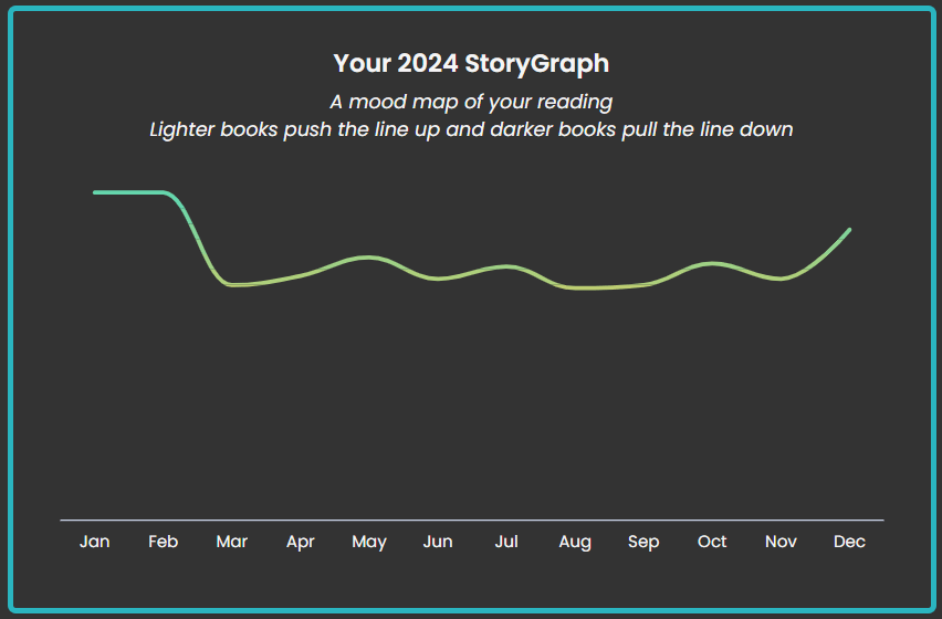 The mood of my books? In 2023 my mood map was pretty much a straight line in the happy zone. This year was a bit more of a rollercoaster. I loved moody emotional books with a happy ending. Nothing too serious, but enough to make my heart squeeze just a bit.