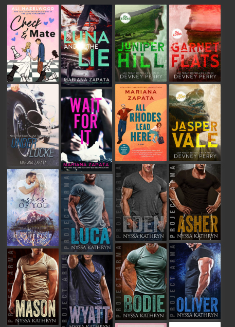 Next was Mariana Zapata, who I have an entire different post dedicated to so I won’t harp on that too much more. All you need to know is that I read through the rest of her catalog and then reread my favorites. She has a very stream-of-consciousness writing style which can get a bit long-winded at times. If you’re okay with that, I truly love her as a slow-burn, character-driven author.